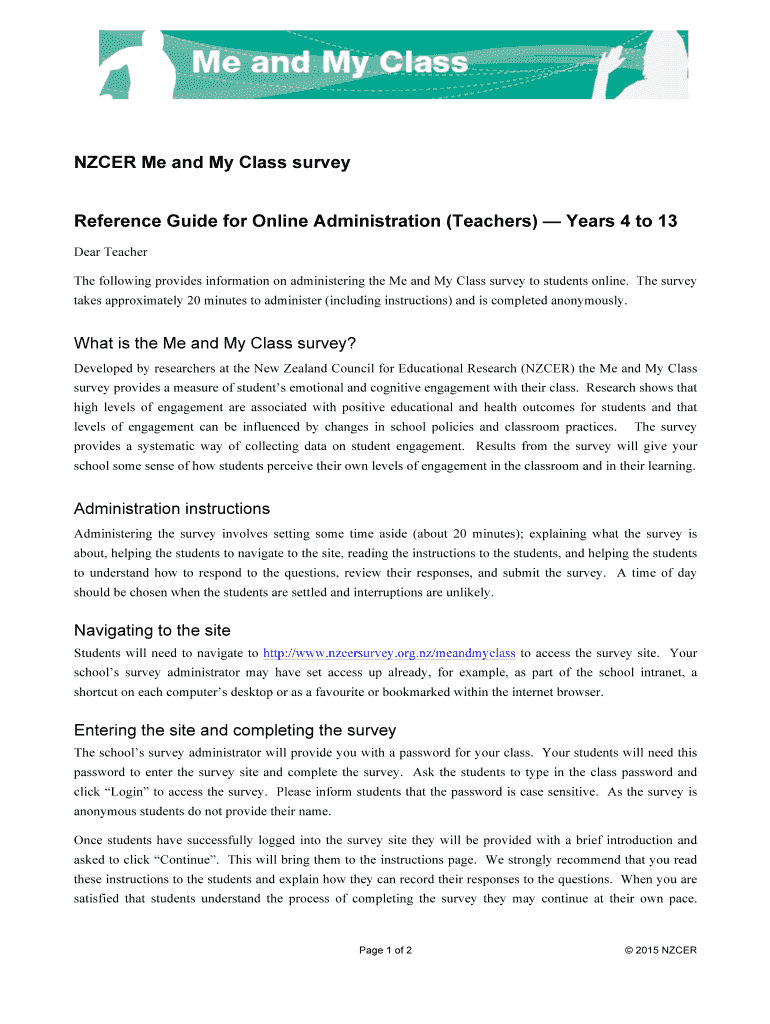 NICER Me and My Class survey Reference Guide for Online Administration (Teachers) Years 4 to 13 Dear Teachers The following provides information on administering the and My Class survey to students