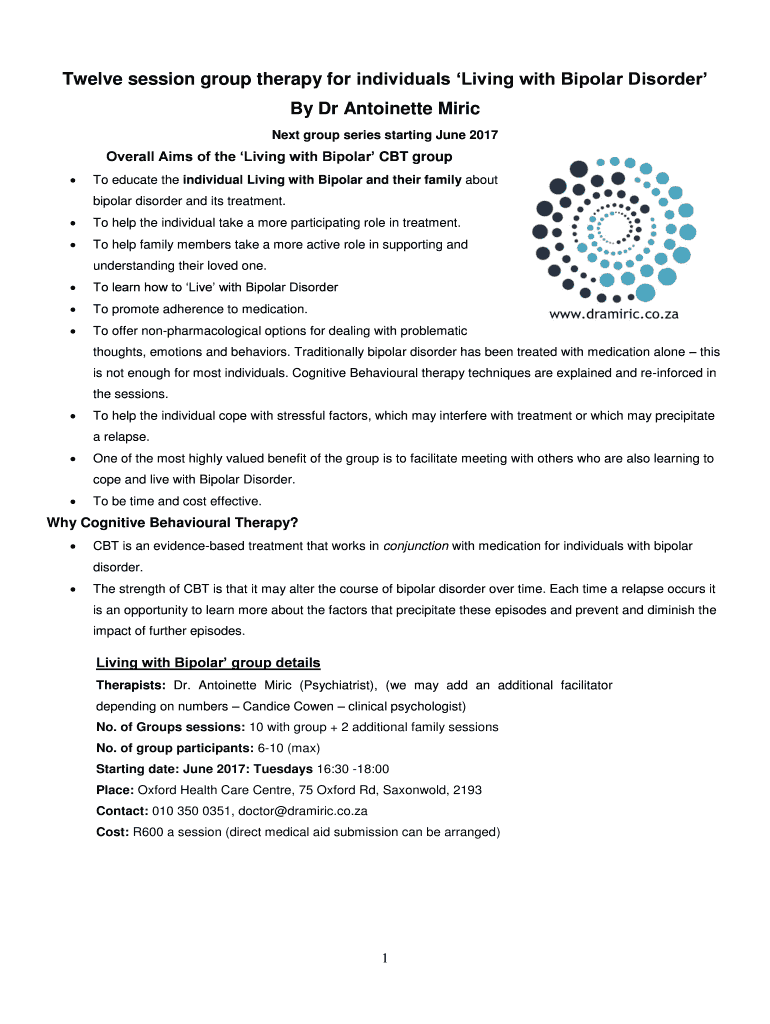 Next group series starting June 2017Overall Aims of the Living with Bipolar CBT group