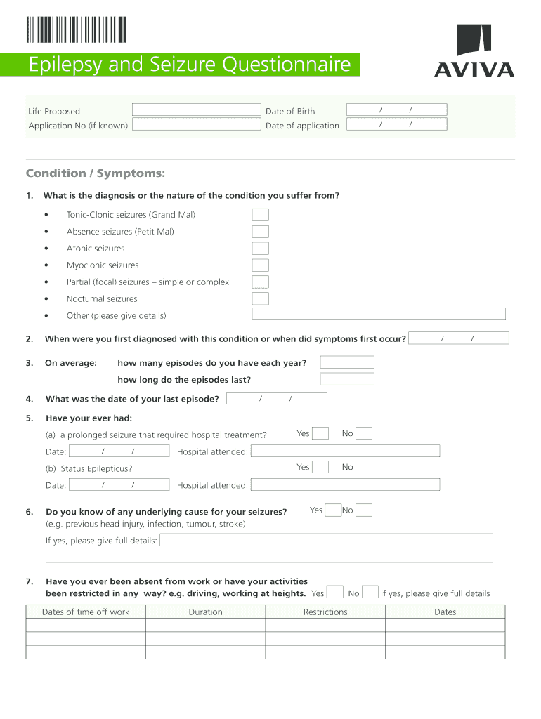 Epilepsy and Seizure Questionnaire/ /Life ProposedDate of BirthApplication No (if known)Date of application/ /Condition / Symptoms: 1. What is the diagnosis or the nature of the condition you suffer