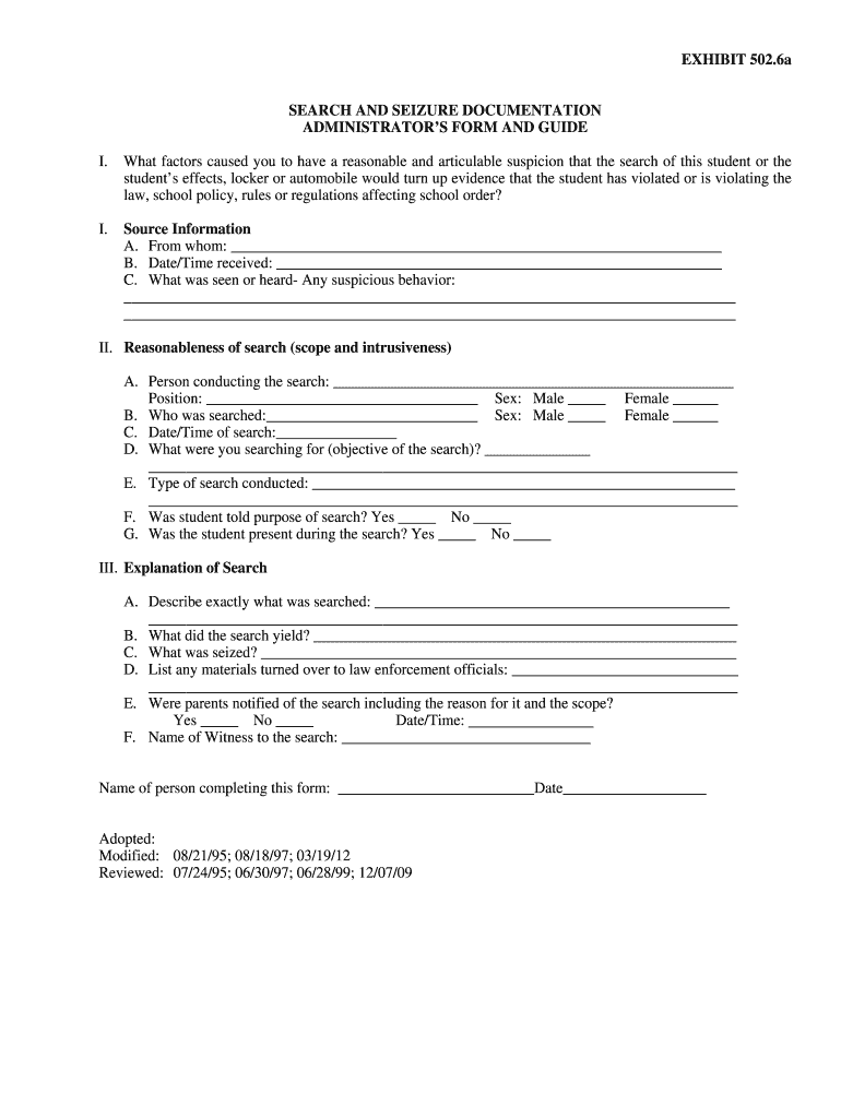 EXHIBIT 502.6a SEARCH AND SEIZURE DOCUMENTATION ADMINISTRATORS FORM AND GUIDE I. What factors caused you to have a reasonable and articulate suspicion that the search of this student or the students