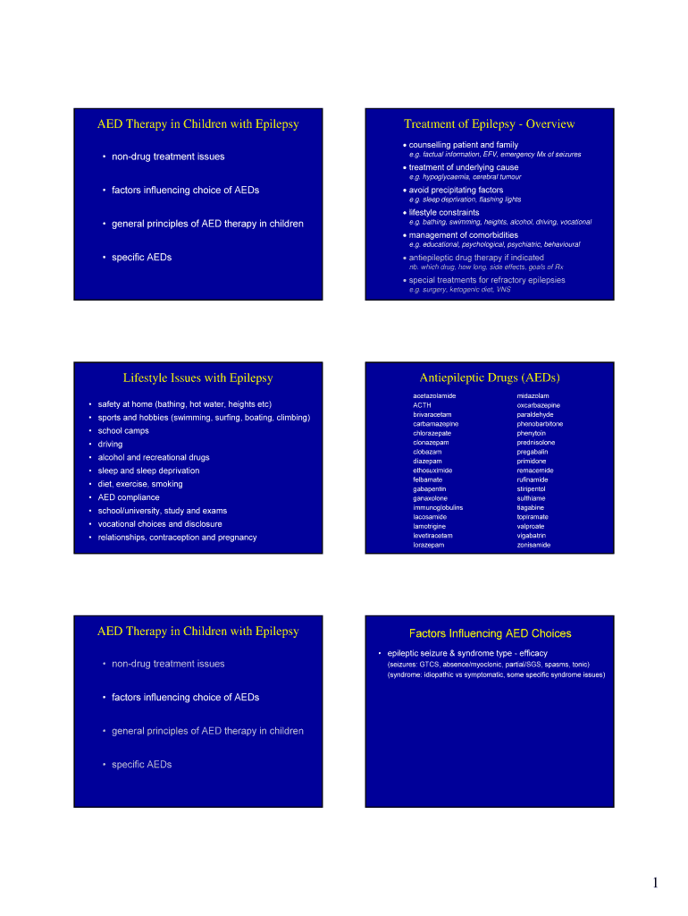 AED Therapy in Children with EpilepsyTreatment of Epilepsy Overview counselling patient and family nondrug treatment issues.g. factual information, EFA, emergency MX of seizures treatment of underlying
