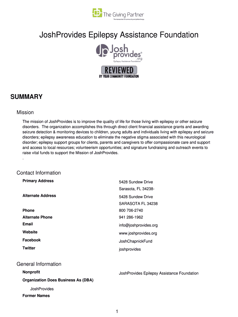 JoshProvides Epilepsy Assistance FoundationSUMMARY Mission The mission of JoshProvides is to improve the quality of life for those living with epilepsy or other seizure disorders. The organization