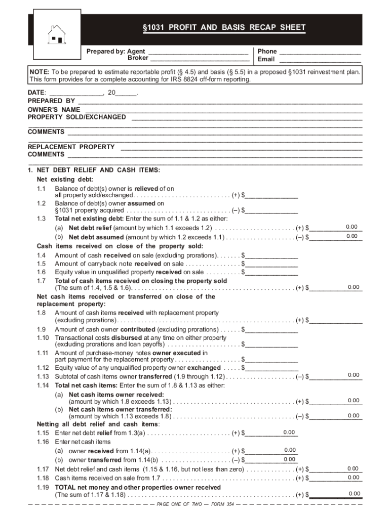 1031 PROFIT AND BASIS RECAP SHEET Prepared by: Agent ___ Broker ___Phone ___ Email ___NOTE: To be prepared to estimate reportable profit (4.5) and basis (5.5) in a proposed 1031 reinvestment plans.