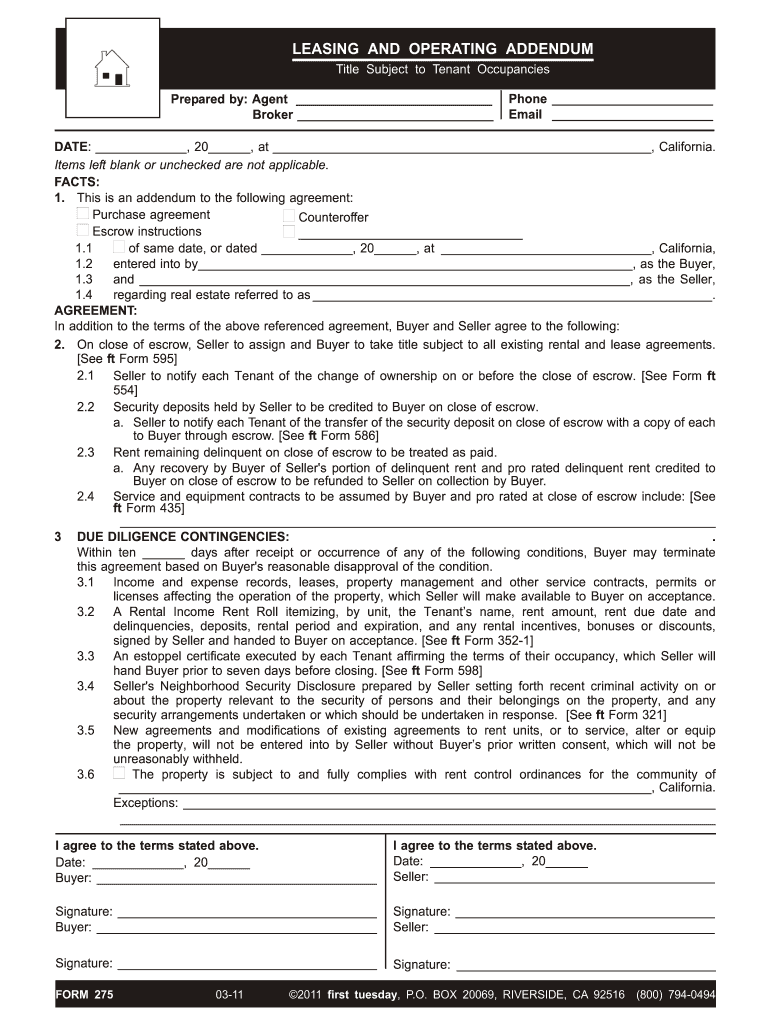 The Leasing and Operating Addendum is a legal document used by Buyers and Sellers in California to modify the terms of a real estate purchase agreement regarding rental agreements and operational details.