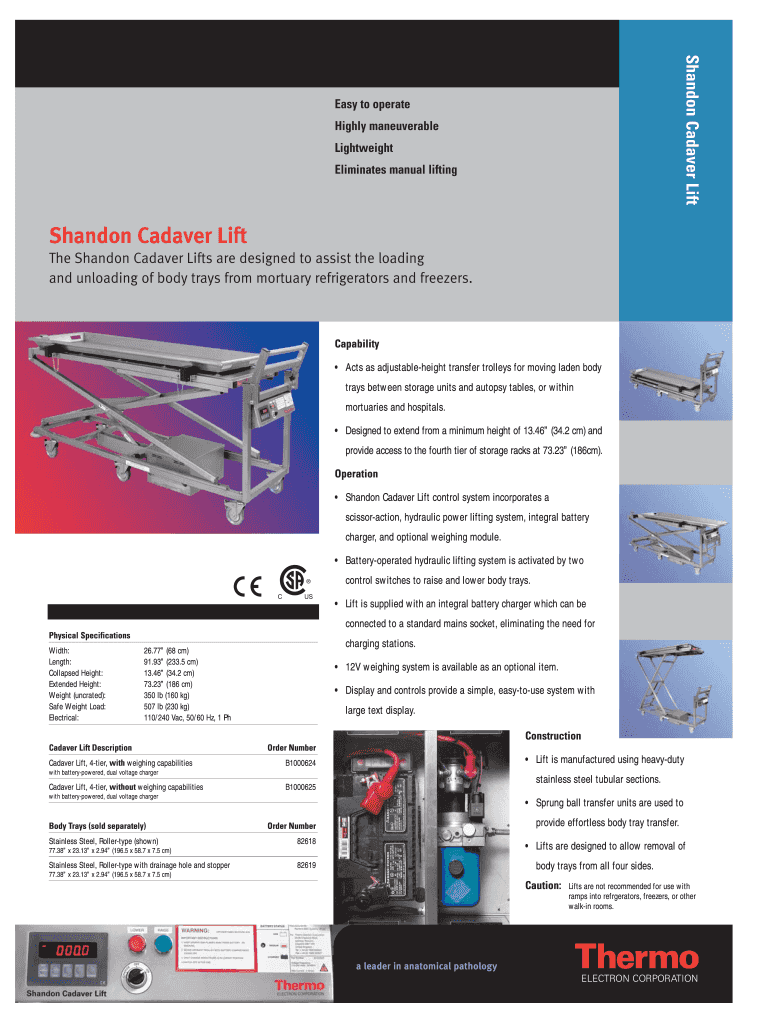 Shannon Cadaver Lightest to operate Highly maneuverable Lightweight Eliminates manual liftingShandon Cadaver Lift The Shannon Cadaver Lifts are designed to assist the loading and unloading of body