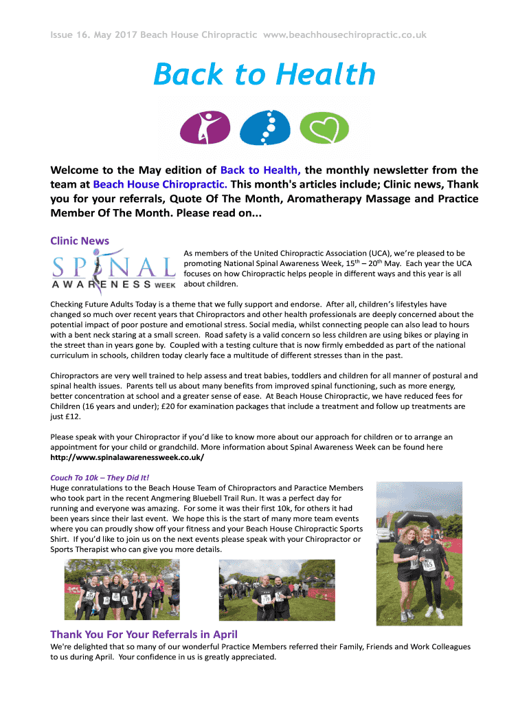Issue 16. May 2017 Beach House Chiropractic www.beachhousechiropractic.co.ukBack to Health Welcome to the May edition of Back to Health, the monthly newsletter from the team at Beach House Chiropractic.