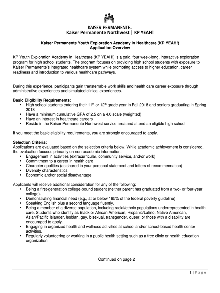 Kaiser Permanent Northwest KP YEAH! Kaiser Permanent Youth Exploration Academy in Healthcare (KP YEAH!) Application Overview KP Youth Exploration Academy in Healthcare (KP YEAH!) is a paid, four weeklong,