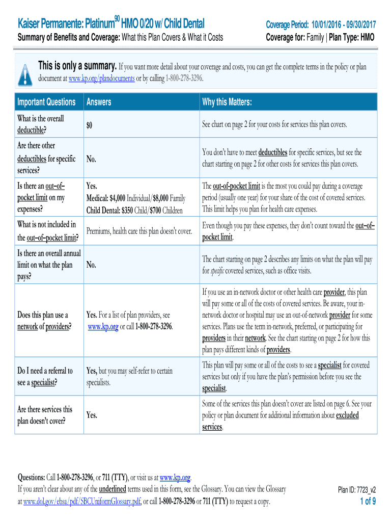 Kaiser Permanent: Platinum90 HMO 0/20 w/ Child Dental Summary of Benefits and Coverage: What this Plan Covers & What it CostsCoverage Period: 10/01/2016 09/30/2017 Coverage for: Family Plan Type: