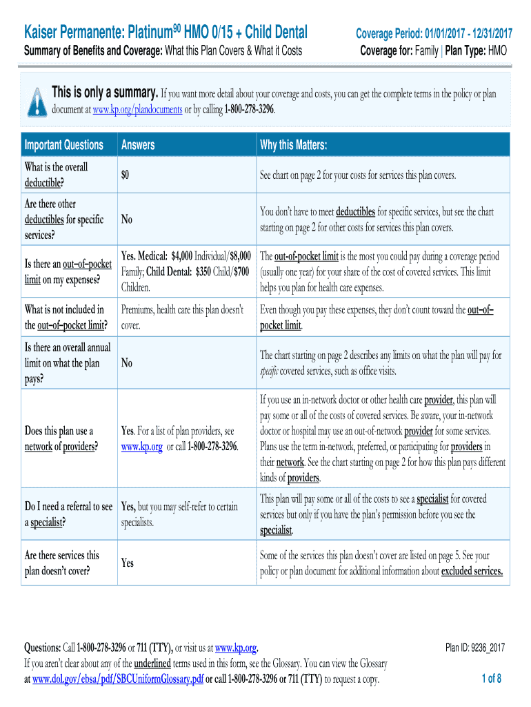 Kaiser Permanent: Platinum90 HMO 0/15 + Child Dental Summary of Benefits and Coverage: What this Plan Covers & What it CostsCoverage Period: 01/01/2017 12/31/2017 Coverage for: Family Plan Type: Moths