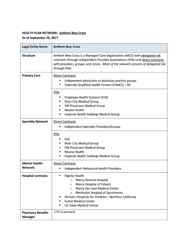 HEALTH PLAN NETWORK: Anthem Blue Cross As of September 29, 2017, Legal Entity NameAnthem Blue CrossStructureAnthem Blue Cross is a Managed Care Organization (MCO) with delegated risk contracts through