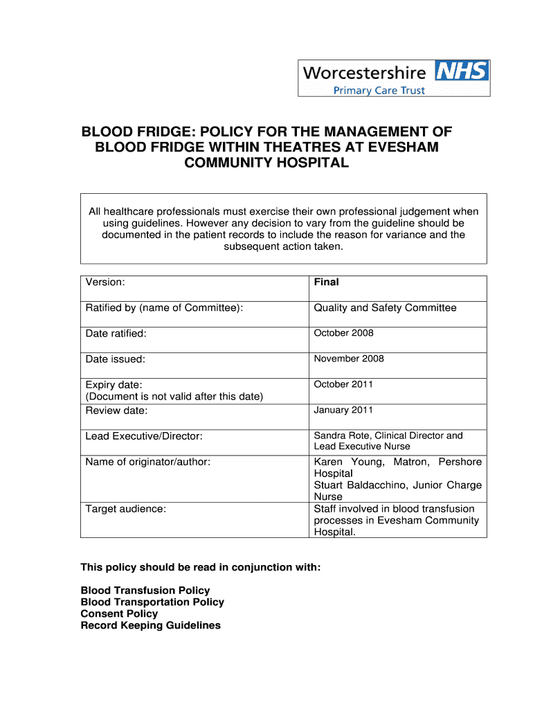 Get the free BLOOD FRIDGE: POLICY FOR THE MANAGEMENT OF