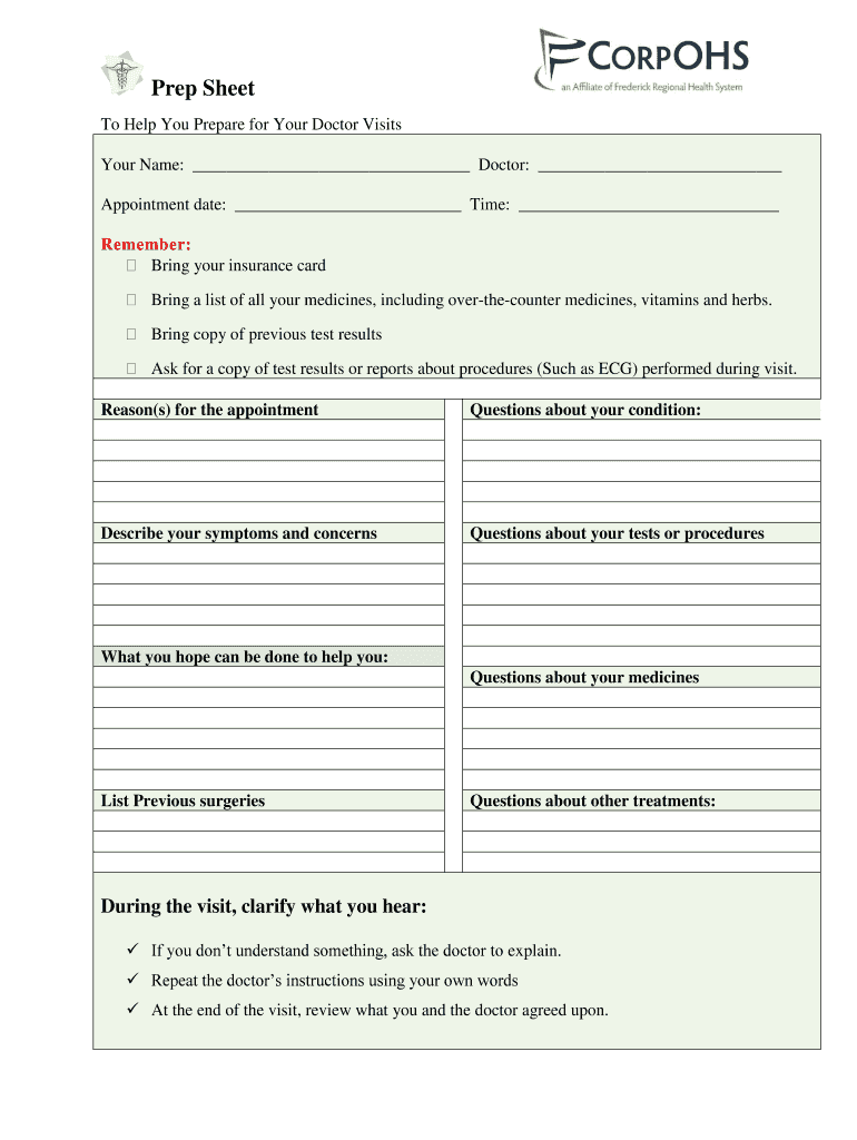 Prep Sheet To Help You Prepare for Your Doctor Visits Your Name: Doctor: Appointment date: Time: Remember: Bring your insurance card Bring a list of all your medicines, including overthecounter medicines,