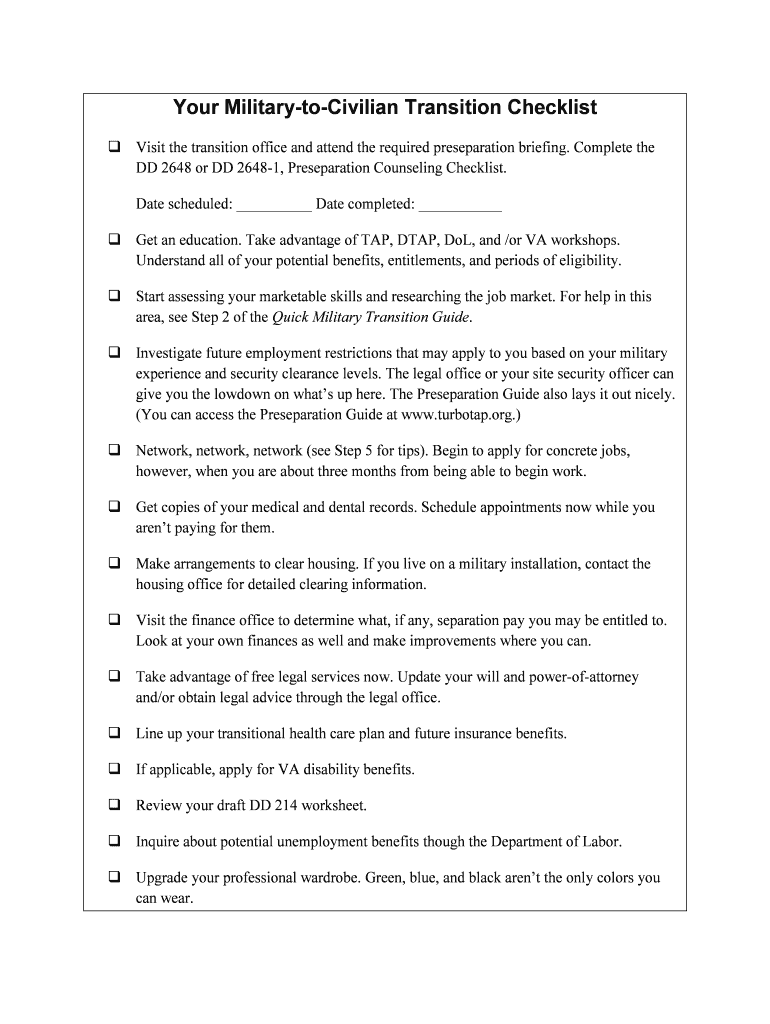 Your MilitarytoCivilian Transition Checklist Visit the transition office and attend the required preparation briefing. Complete the DD 2648 or DD 26481, Preparation Counseling Checklist. Date scheduled: