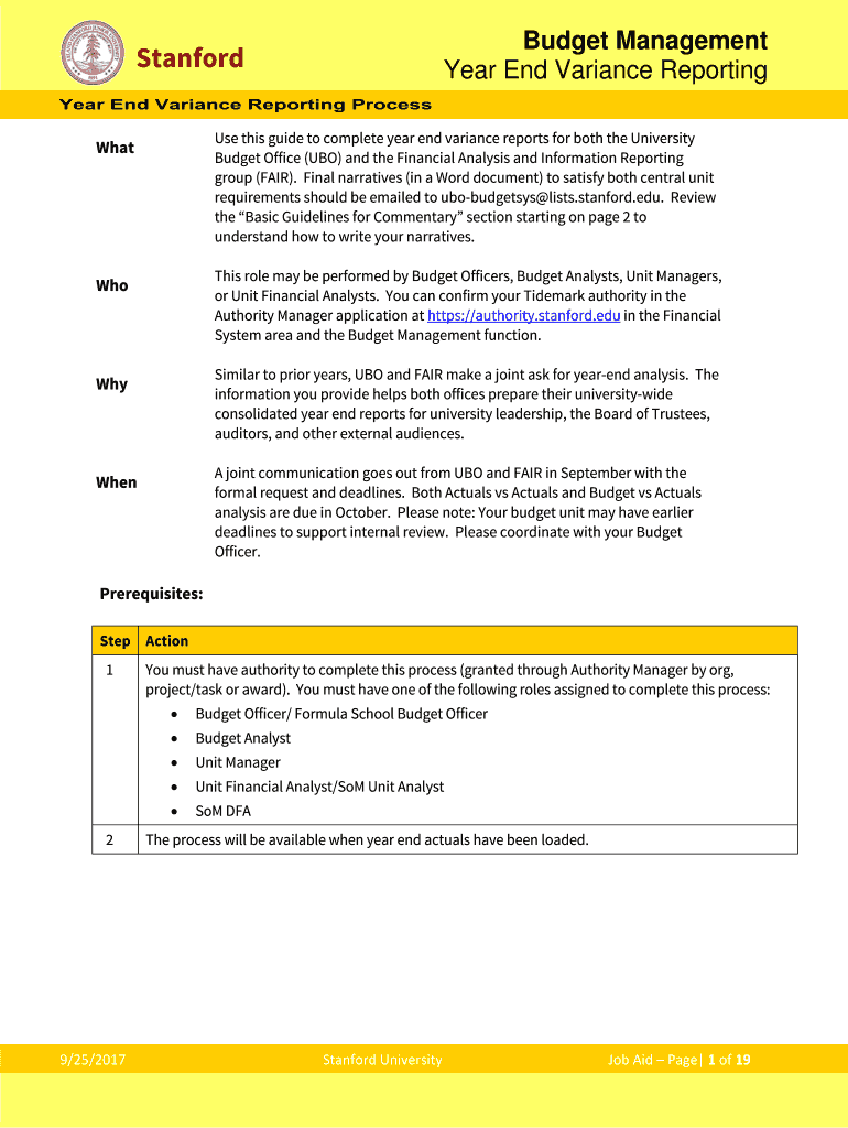 Budget Management Year End Variance Reporting Stanford Use this guide to complete year-end variance reports for both the University Budget Office (HBO) and the Financial Analysis and Information Reporting