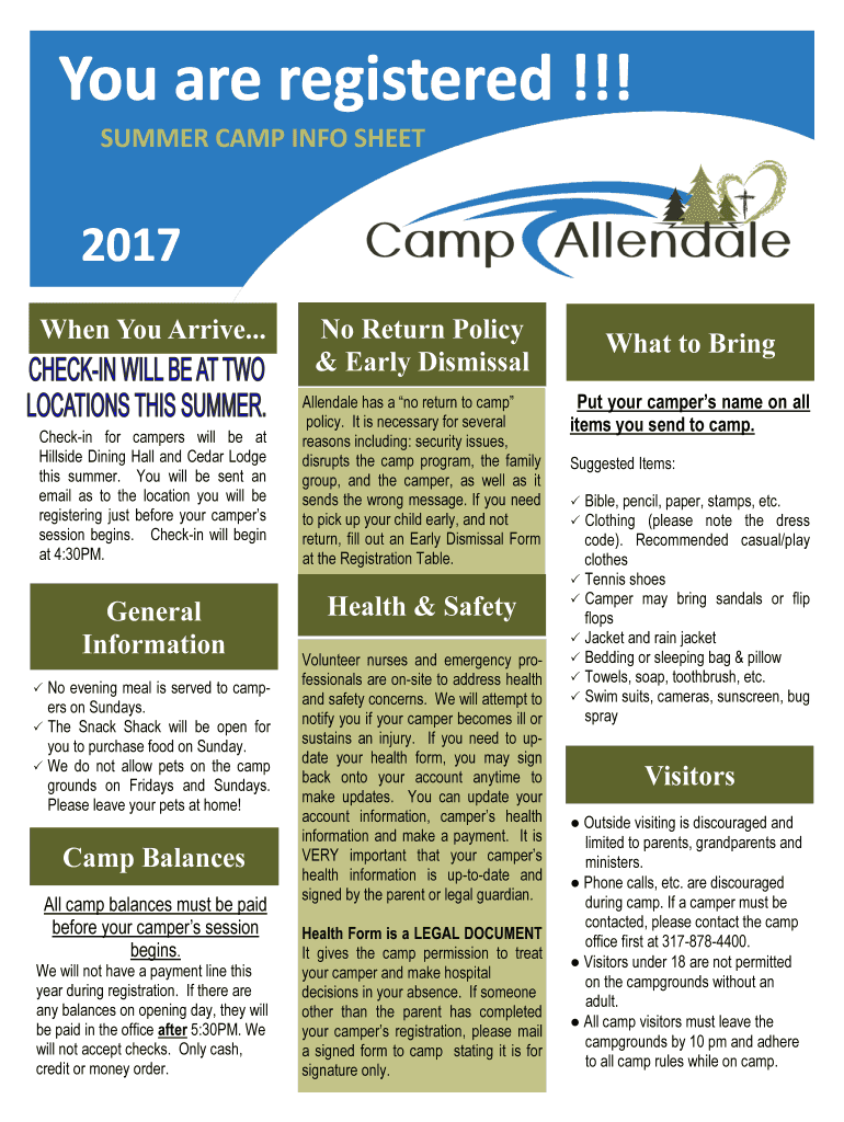 You are registered !!! SUMMER CAMP INFO SHEET2017 When You Arrive... Checking for campers will be at Hillside Dining Hall and Cedar Lodge this summer. You will be sent an email as to the location