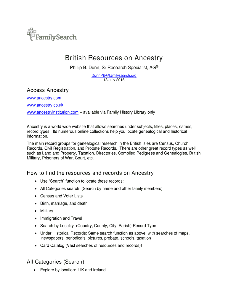 British Resources on Ancestry Phillip B. Dunn, Sr Research Specialist, AG Dunn PB family search.org 13 July 2016Access Ancestry www.ancestry.com www.ancestry.co.uk www.ancestryinstitution.com available