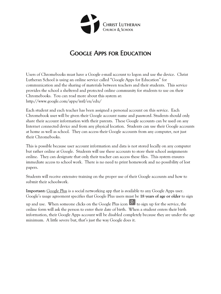 Get the free Users of Chromebooks must have a Google e-mail account to logon and use the device