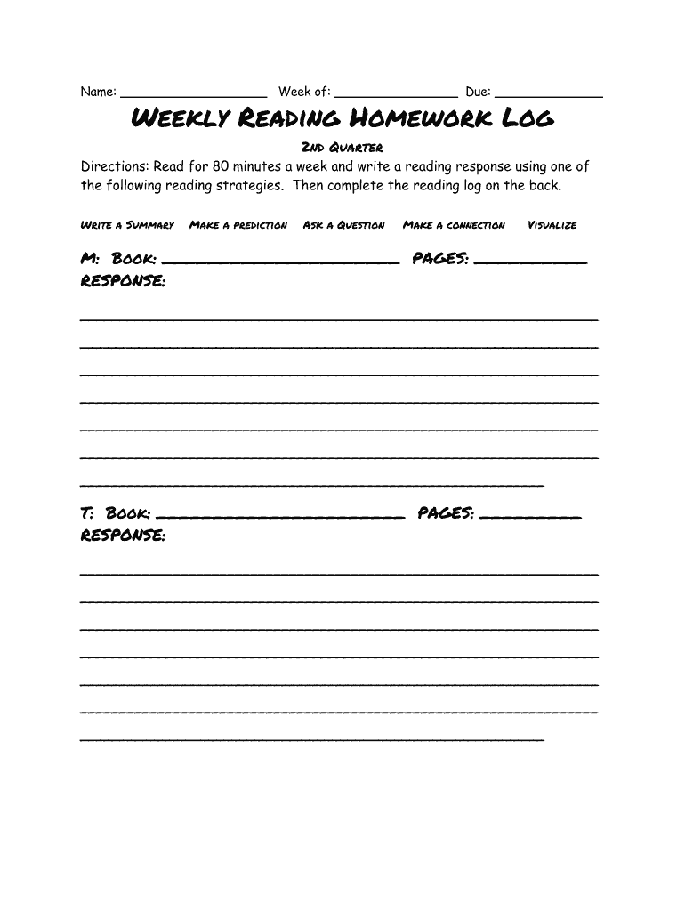 Name: Week of: Due: Weekly Reading Homework Log2nd Quarter Directions: Read for 80 minutes a week and write a reading response using one of the following reading strategies. Then complete the reading