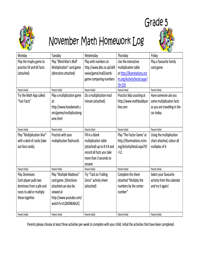 How to fill out november math homework log?