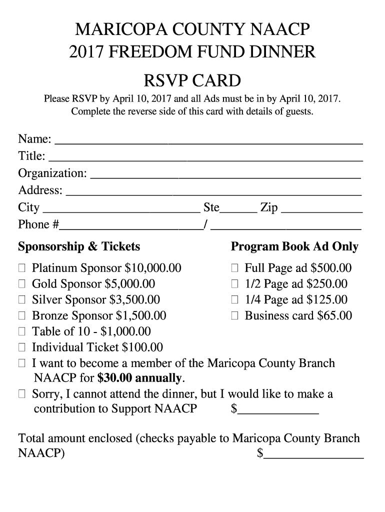 MARICOPA COUNTY NAACP 2017 FREEDOM FUND DINNER RSVP CARD Please RSVP by April 10, 2017, and all Ads must be in by April 10, 2017. Complete the reverse side of this card with details of guests. Name:
