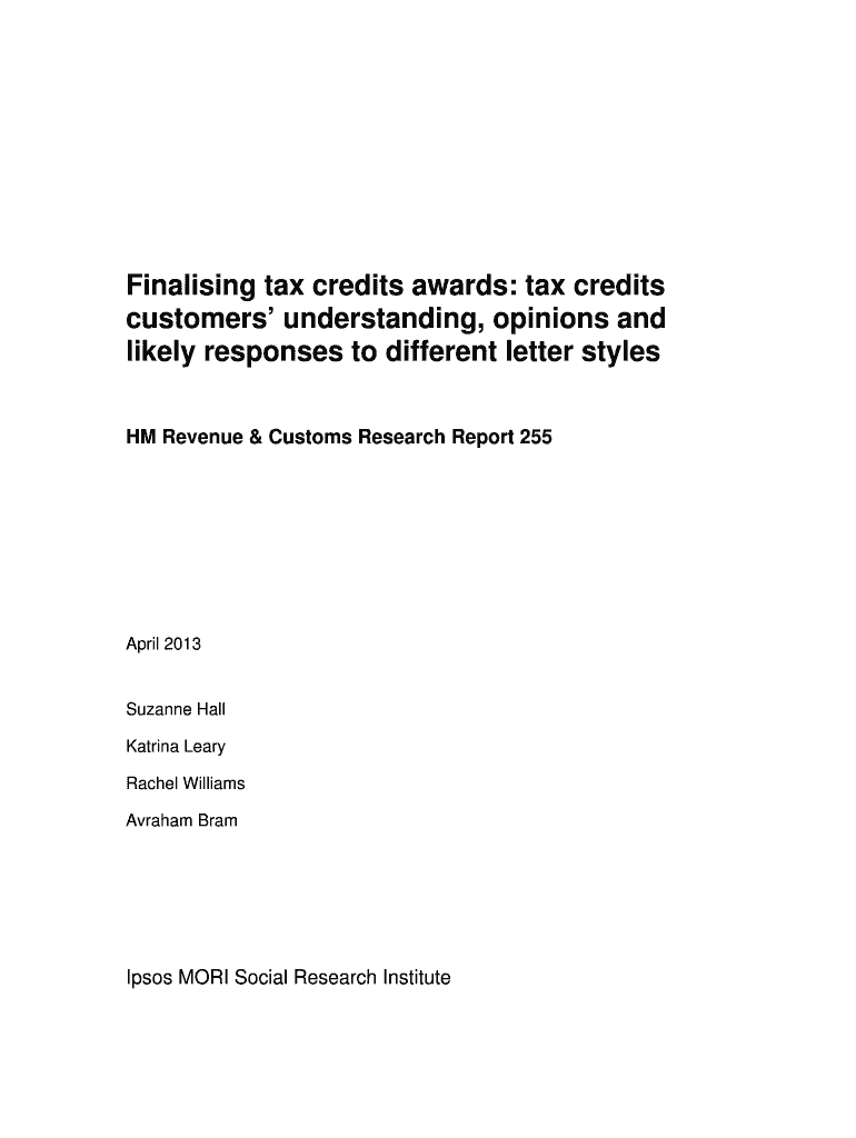 Finalizing tax credits awards: tax credits customers understanding, opinions and likely responses to different letter styles HM Revenue & Customs Research Report 255April 2013Suzanne Hall Katrina