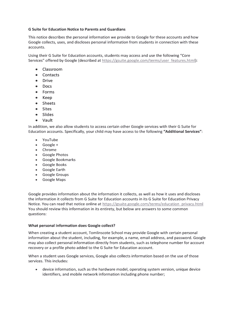 G Suite for Education Notice to Parents and Guardians This notice describes the personal information we provide to Google for these accounts and how Google collects, uses, and discloses personal information