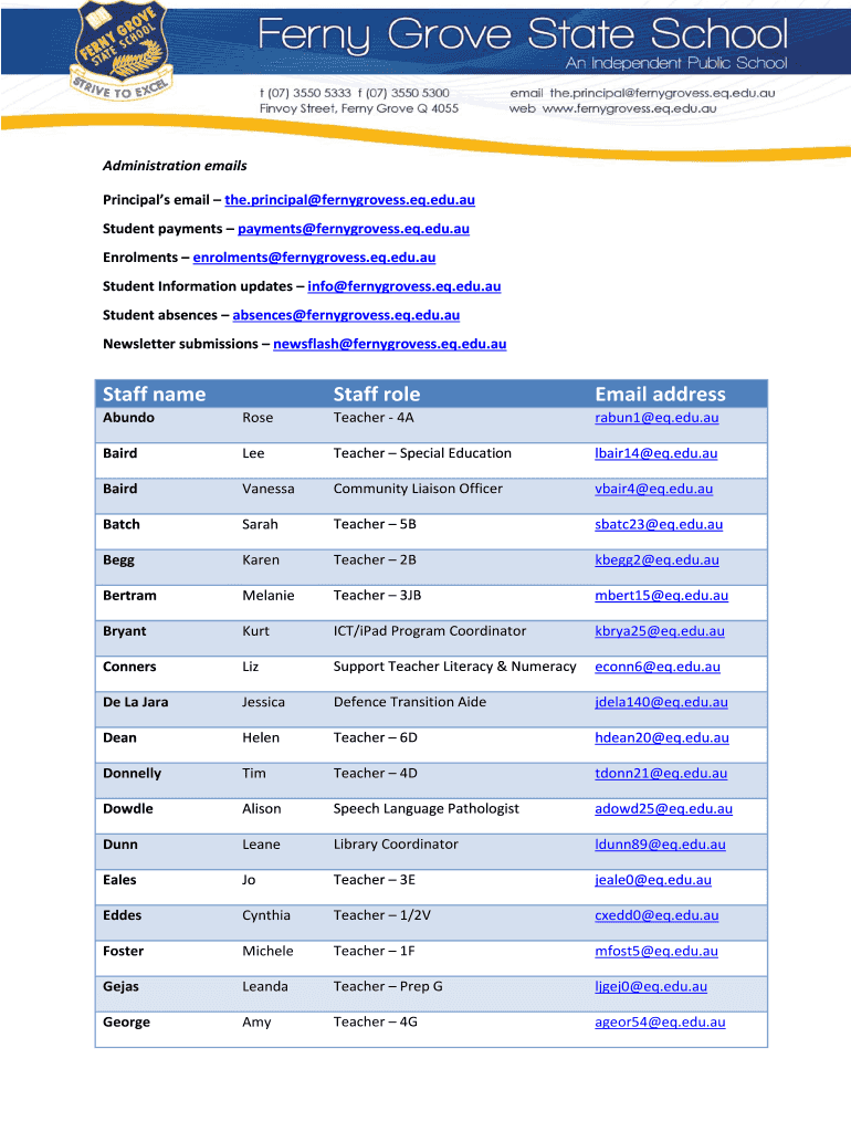 Administration emails Principals email the. Principal fernygrovess.EQ.edu.AU Student payments fernygrovess.EQ.edu.AU Enrollments fernygrovess.EQ.edu.AU Student Information updates info fernygrovess.EQ.edu.AU