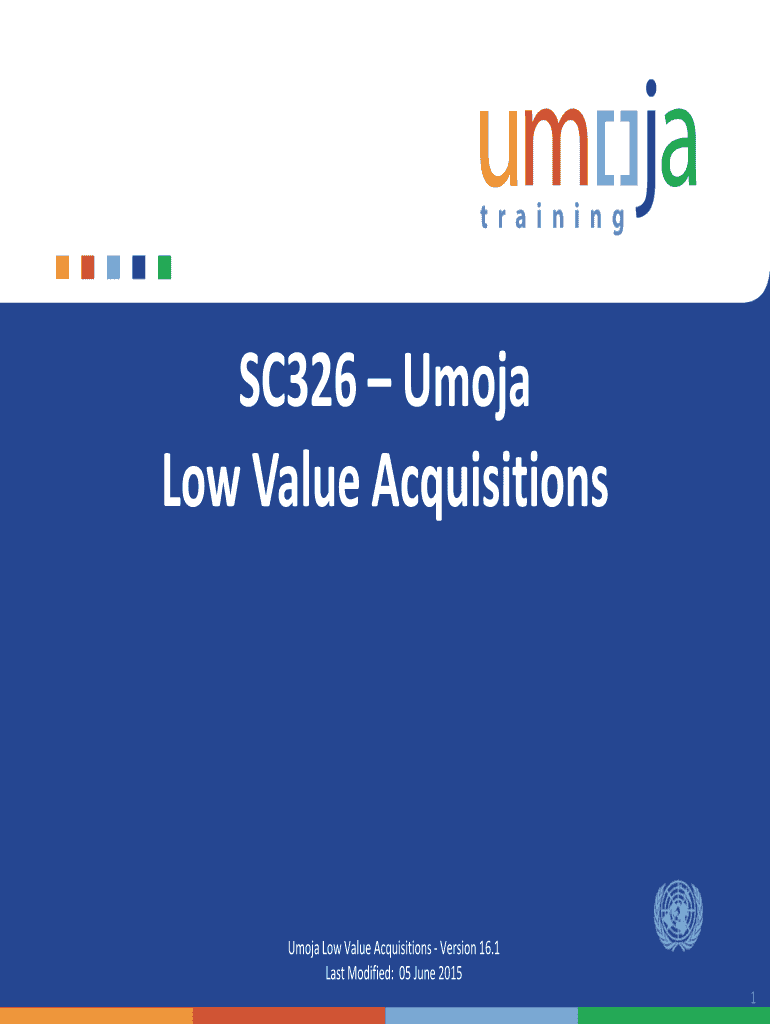 SC326 Mona Low Value AcquisitionsUmoja Low Value Acquisitions Version 16.1 Last Modified: 05 June 2015 Copyright United Nations1Course Overview The purpose of the Mona Low Value Acquisitions course