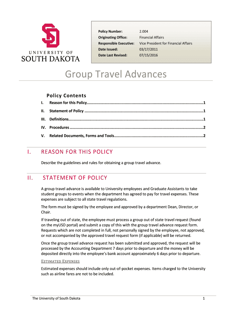 Policy Number:2.004Originating Office:Financial AffairsResponsible Executive:Vice President for Financial AffairsDate Issued:03/17/2011Date Last Revised:07/15/2016Group Travel Advances