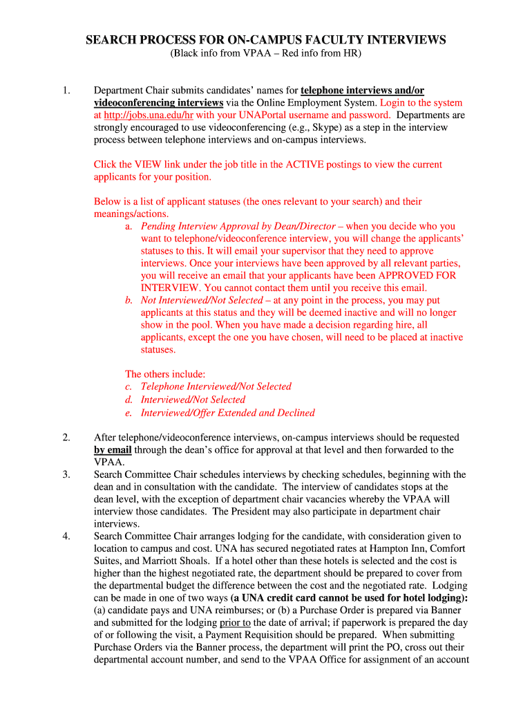 SEARCH PROCESS FOR CAMPUS FACULTY INTERVIEWS (Black info from VP AA Red info from HR)1. Department Chair submits candidates names for telephone interviews and/or videoconferencing interviews via the