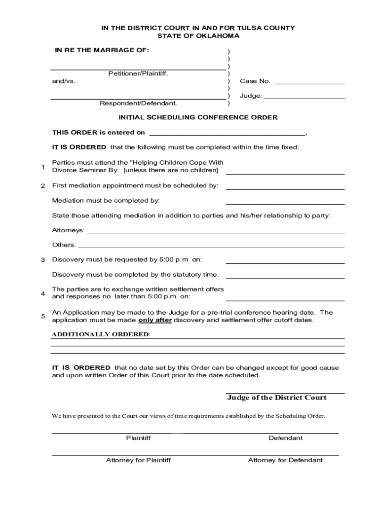 The Initial Scheduling Conference Order is a legal document used by parties in divorce proceedings to establish timelines and requirements for the divorce process in Tulsa County, Oklahoma.