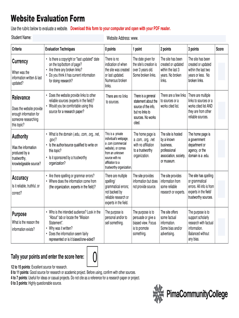 Website Evaluation Form Use the rubric below to evaluate a website. Download this form to your computer and open with your PDF reader. Student Name: CriteriaCurrency When was the information written