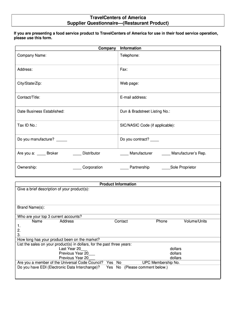 TravelCenters of America Supplier Questionnaire Restaurant Product If you are presenting a food service product to TravelCenters of America for use in their food service operation please use this form. Company Information Company Name Telephone Address Fax City/State/Zip Web page Contact/Title E-mail address Date Business Established Dun Bradstreet Listing No. Tax ID No. SIC/NASIC Code if applicable Do you manufacture Do you contract Are you a Broker Distributor Manufacturer Ownership...