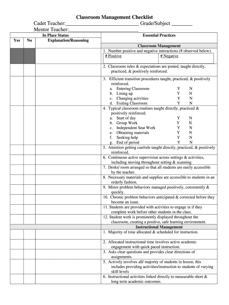 Classroom Management Checklist Cadet Teacher: Grade/Subject Mentor Teacher: Lesson Place Status Explanation/ReasoningEssential Practices Classroom Management 1. Number positive and negative interactions