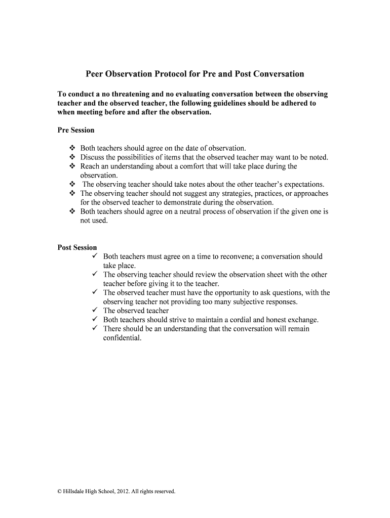 Peer Observation Protocol for PRE and Post Conversation To conduct a no threatening and no evaluating conversation between the observing teacher and the observed teacher, the following guidelines