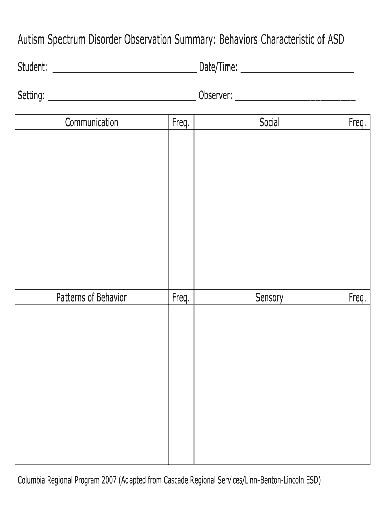 Autism Spectrum Disorder Observation Summary: Behaviors Characteristic of ASD Student: Date/Time: Setting: Observer: CommunicationFreq. Socialite. Patterns of BehaviorFreq. SensoryFreq. Columbia Regional