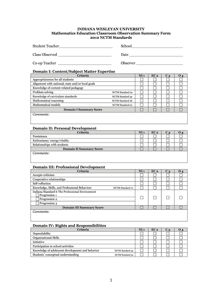 INDIANA WESLEYAN UNIVERSITY Mathematics Education Classroom Observation Summary Form 2012 CTM Standards Student Teacher School Class Observed Date Coop Teacher Observer Domain I: Content/Subject Expertise