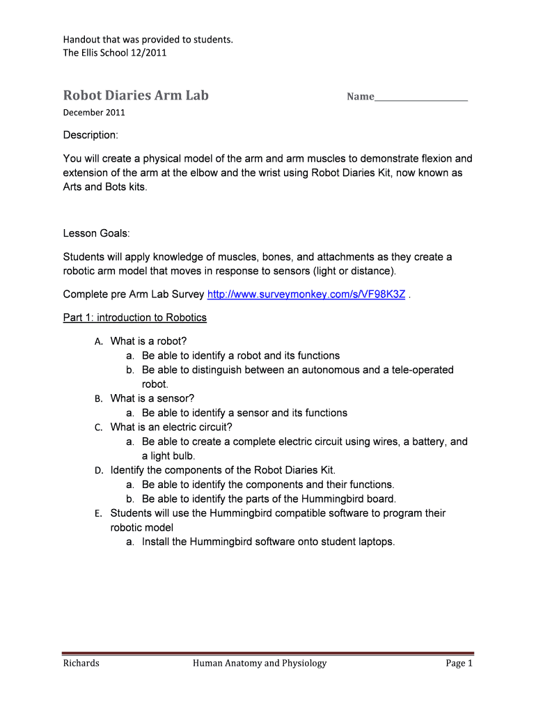 Handoutthatwasprovidedtostudents. TheEllisSchool12/2011RobotDiariesArmLabName December2011Description: You will create a physical model of the arm and arm muscles to demonstrate flexion and extension