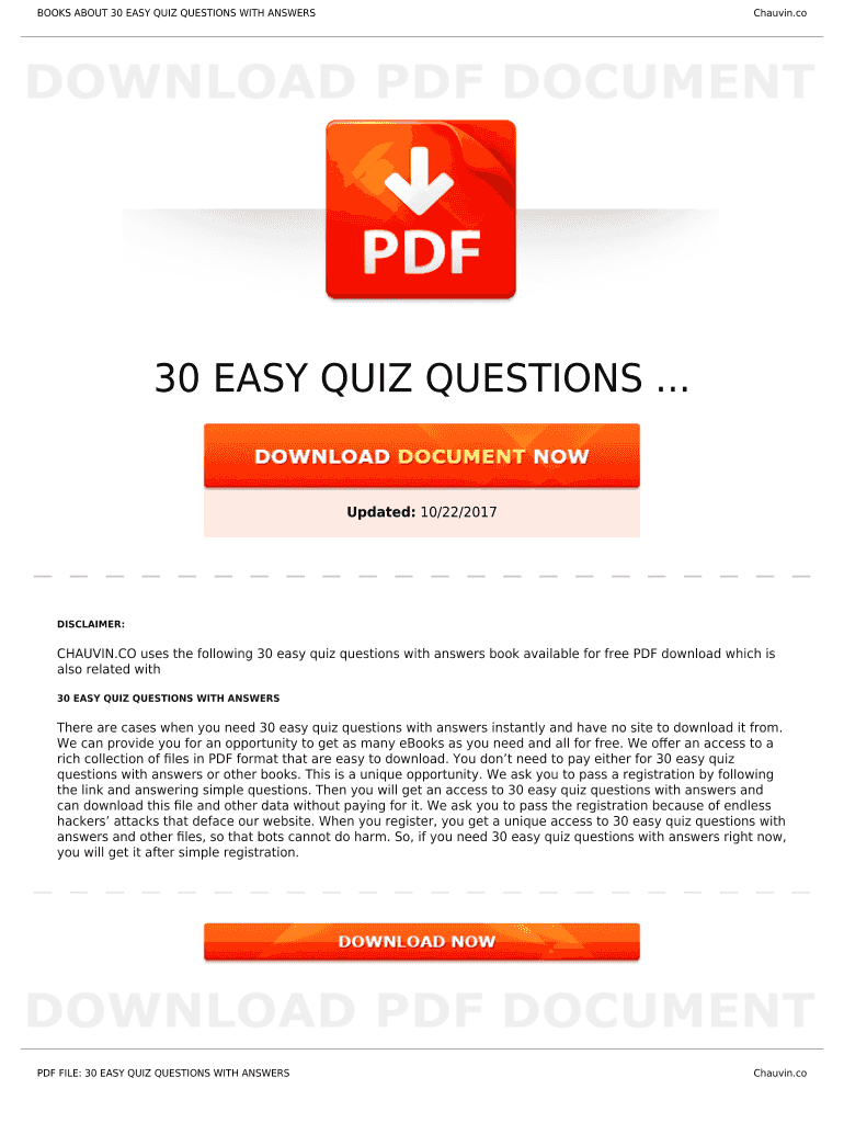 BOOKS ABOUT 30 EASY QUIZ QUESTIONS WITH ANSWERSChauvin.co30 EASY QUIZ QUESTIONS ... Updated: 10/22/2017DISCLAIMER:CHAUVIN.CO uses the following 30 easy quiz questions with answers book available for