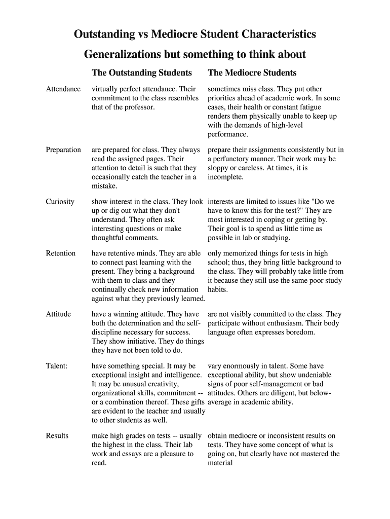 - Compare the student's achievements and qualities with the typical expectations for outstanding vs mediocre students.