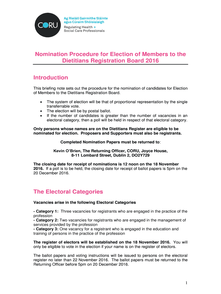 Nomination Procedure for Election of Members to the Dietitians Registration Board 2016 Introduction This briefing note sets out the procedure for the nomination of candidates for Election of Members