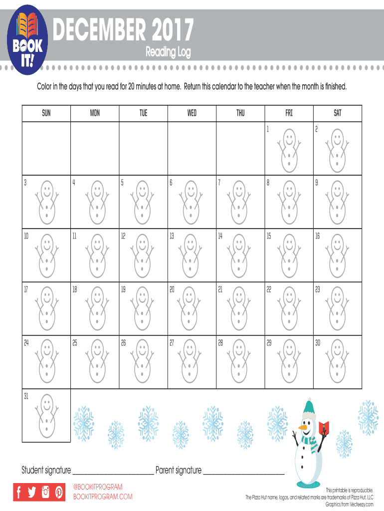 DECEMBER 2017 Reading Color in the days that you read for 20 minutes at home. Return this calendar to the teacher when the month is finished.SUNMONTUEWEDTHUFRISAT12345678910111213141516171819202122232425262728293031Student