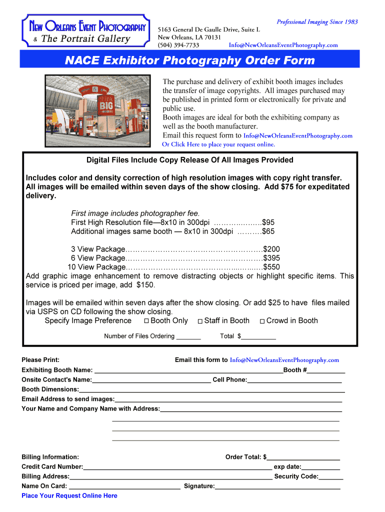 WWW. NewOrleansEventPhotography.com NACE Exhibitor Photography Order Form