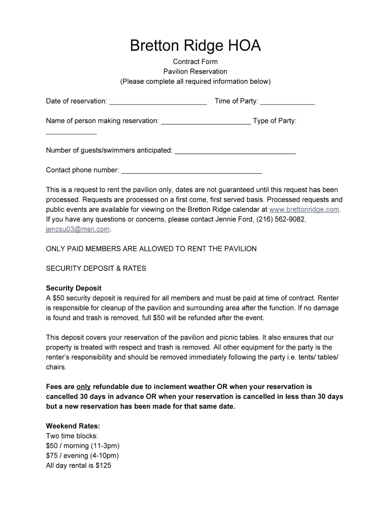Breton Ridge HOA Contract Form Pavilion Reservation (Please complete all required information below) Date of reservation: Time of Party: Name of person making reservation: Type of Party: Number of