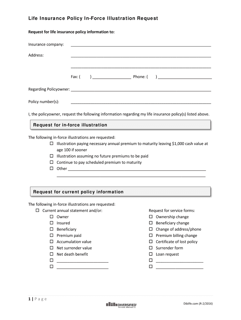 Life Insurance Policy Enforce Illustration Request for life insurance policy information to: Insurance company: Address: Fax: () Phone: () Regarding Policy owner: Policy number(s): I, the policy owner,
