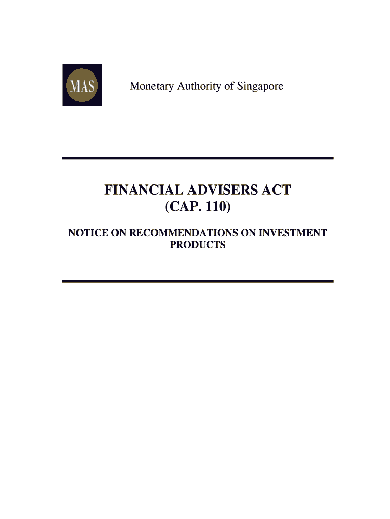 Monetary Authority of SingaporeFINANCIAL ADVISERS ACT (CAP. 110) NOTICE ON RECOMMENDATIONS ON INVESTMENT PRODUCTSNotice No : FAAN16 Issue Date : 28 July 2011 (last updated on 1 January 2012) NOTICE
