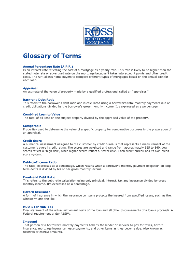 Glossary of Terms Annual Percentage Rate (A.P.R.) Is an interest rate reflecting the cost of a mortgage as a yearly rate. This rate is likely to be higher than the stated note rate or advertised rate