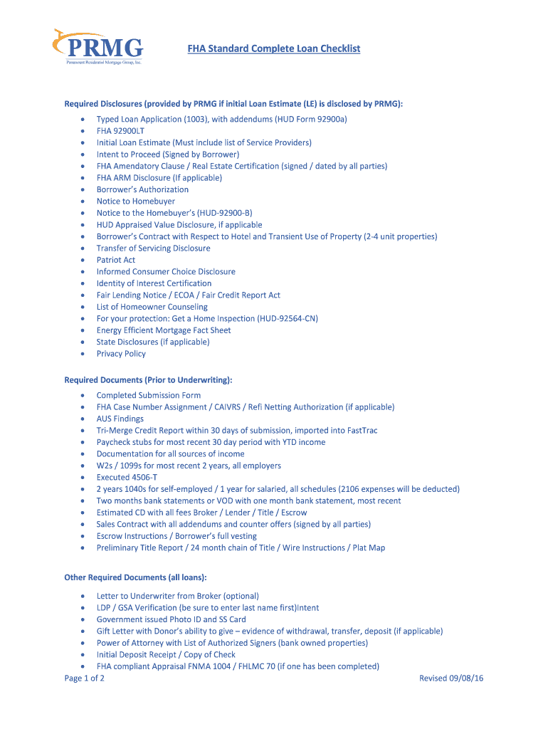 FHA Standard Complete Loan ChecklistRequired Disclosures (provided by PRIG if initial Loan Estimate (LE) is disclosed by PRIG): Typed Loan Application (1003), with addendums (HUD Form 92900a) FHA