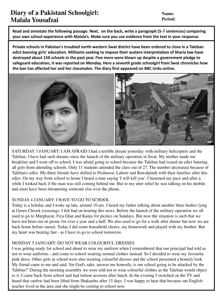 This document comprises excerpts from the diary of Malala Yousafzai, detailing her experiences and challenges as a schoolgirl in Pakistan under Taliban rule, and her subsequent rise to international