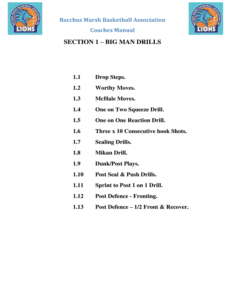 Bacchus Marsh Basketball Association Coaches ManualSECTION 1 BIG MAN DRILLS1.1Drop Steps.1.2Worthy Moves.1.3McHale Moves.1.4One on Two Squeeze Drill.1.5One on One Reaction Drill.1.6Three x 10 Consecutive